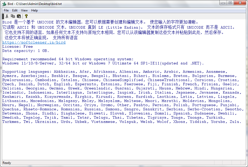 Bird è un editor di testo all'avanguardia basato su UNICODE, progettato per offrire una chiarezza e una precisione senza pari nella creazione e modifica del testo. Che tu stia lavorando con caratteri ASCII o UNICODE (fino a Little Endian), Bird garantisce che ogni carattere inserito sia visualizzato con una chiarezza impeccabile. Il formato di salvataggio del testo è esclusivamente UNICODE, assicurando un rendering del testo coerente e affidabile su diverse piattaforme.