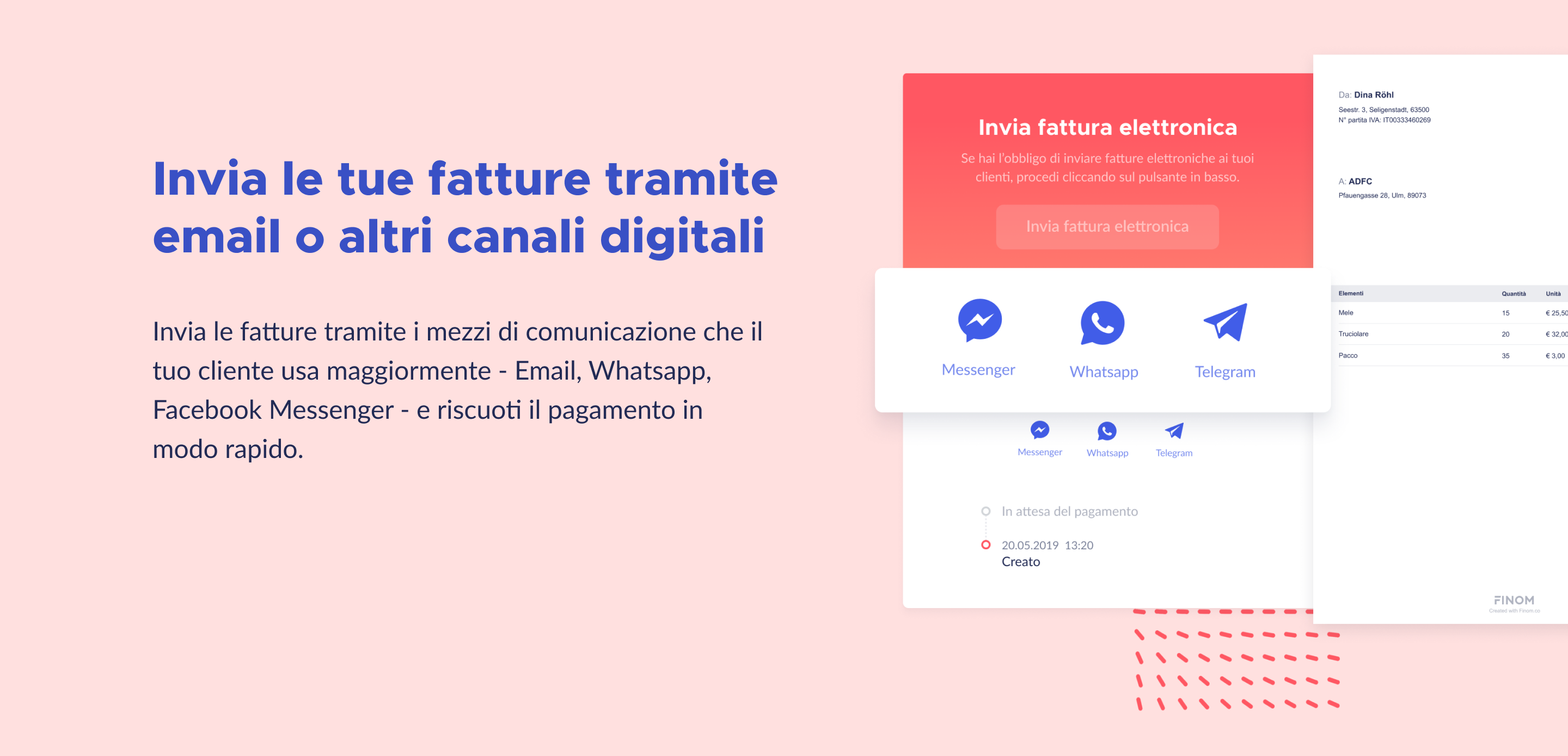 FINOM, non solo ti permette di inviare fatture elettroniche, ma ti consente anche di condividerle digitalmente via mail, telegram, messenger o whatsapp. Tu devi solo identificare il canale che fa per te. - Fatture pagate sempre in tempo