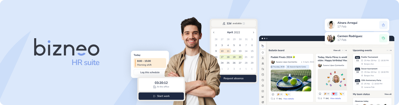 Bizneo HR è una suite HR che offre oltre 16 moduli per l'autogestione e l'ottimizzazione operativa di processi come: Reclutamento, Assenze, Controllo Orario e turni, Valutazione delle prestazioni, Report, Sondaggi, Formazione e altri, personalizzabili nel portale di ogni dipendente.