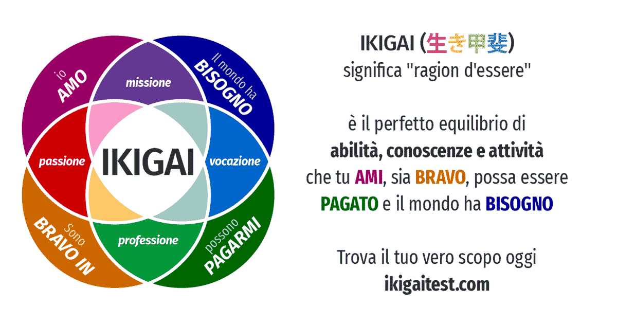 Per estensione, il concetto di ikigai è sempre più applicato all’attività professionale per trovare il proprio lavoro ideale. Se consideriamo che gli italiani lavorano in media 33 ore a settimana, ben 3 ore in più rispetto alla media europea di 30, risulta evidente l’importanza di riflettere sul come rendere il lavoro più appagante (fonte: QuiFinanza).